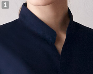 首元をすっきり見せるスタンドカラー仕様。凛とした印象を与えます。