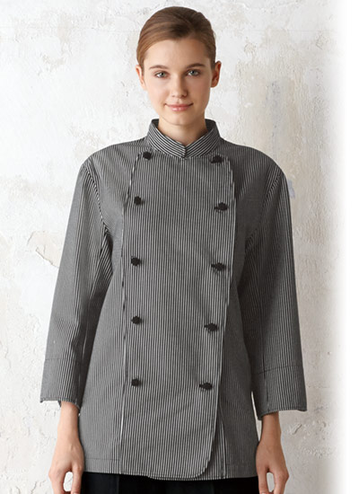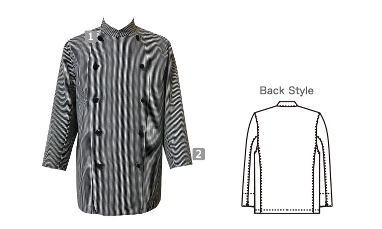無地ではなく、ストライプのコックコートは、オシャレに着こなせるだけでなく、汚れが目立ちにくいという利点があります。