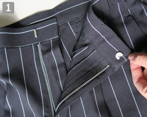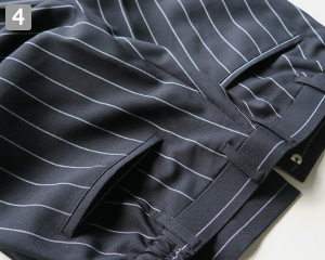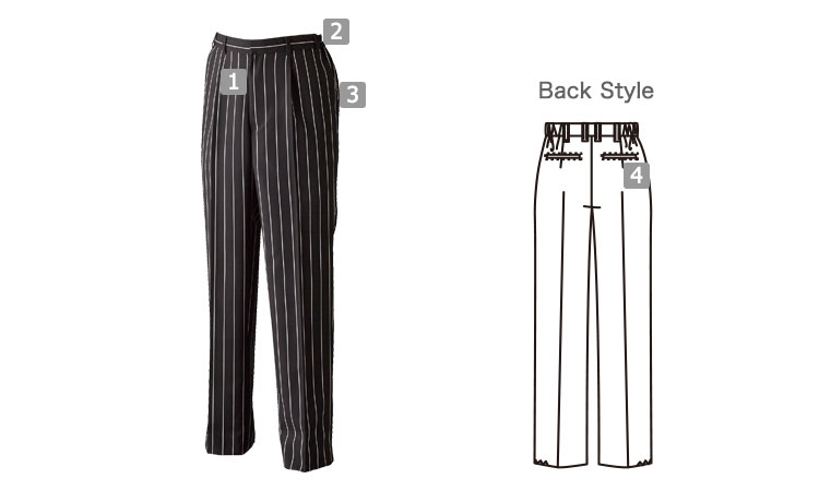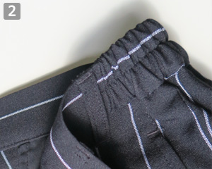- フロントファスナー、ウエスト脇ゴム仕様、両脇ポケット、左右ヒップポケット