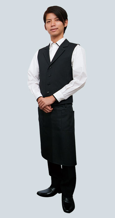 ピンストライプ地のスマートな黒で白い空間に映えるベストです。美しいシルエットを実現しました。