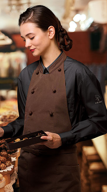 スタイリッシュなコックエプロンは、コックコートに使われる厚めの生地を採用。リッチな印象のダブルのタイプは飾りボタンも相まってきちんとした印象。第二ボタンまで開くので着脱も簡単で、抗菌防臭機能も嬉しい。ショコラティエやパティスリーなど贅沢な空間をおしゃれに演出します。