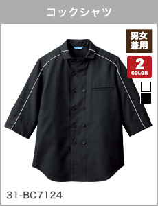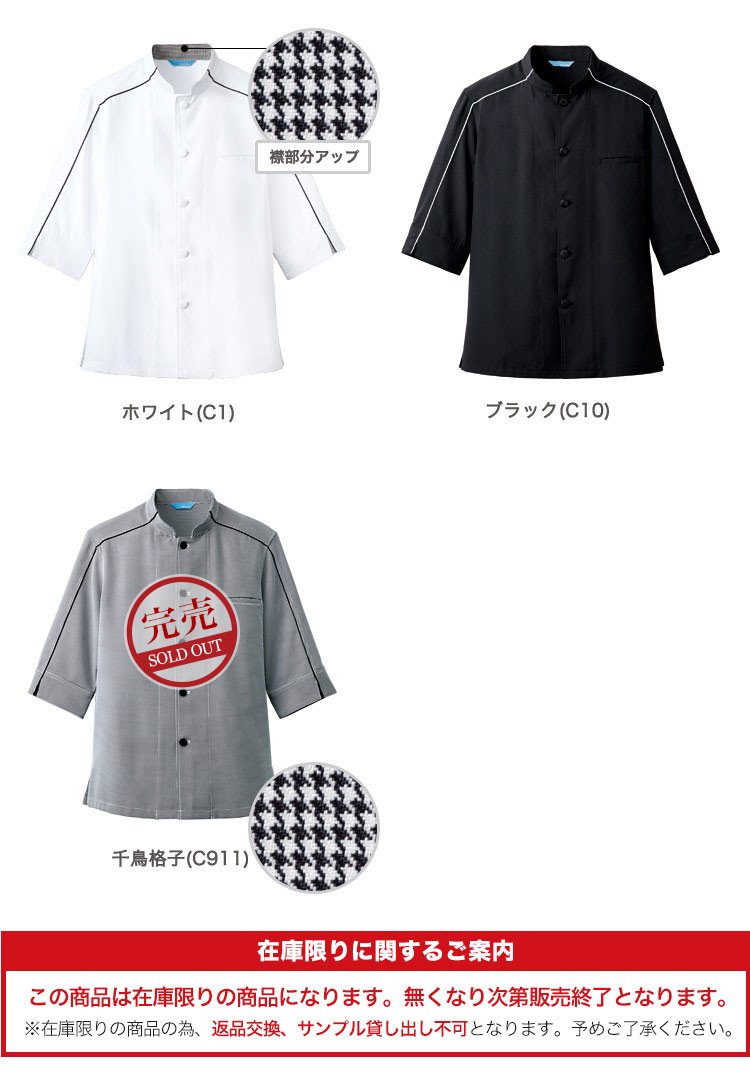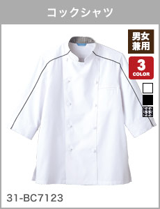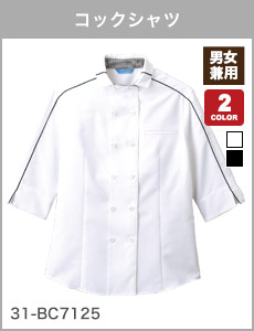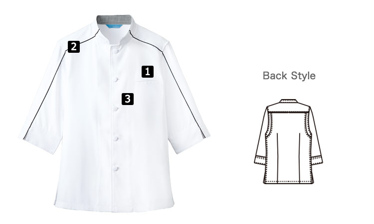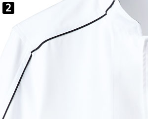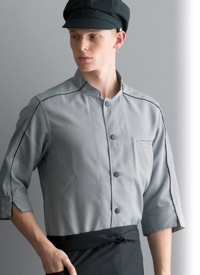 アクセントにパイピングをあしらい、モノトーンの配色がかっこいいデザインの七分袖のコックシャツ。