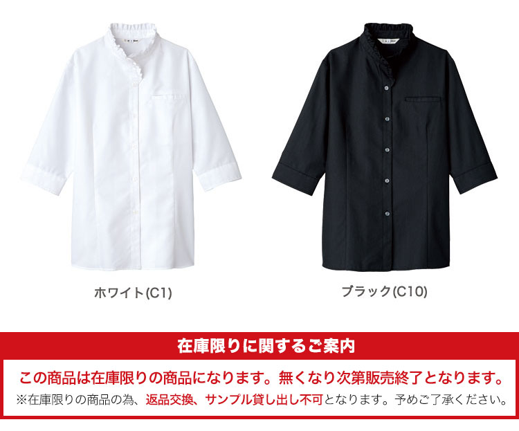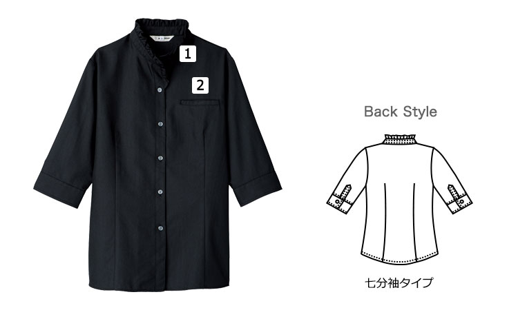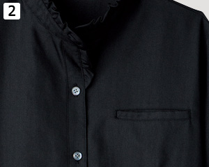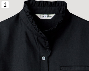 洗練された印象を与えるスタンドカラーにフリルがあしらわれている事で、女性らしい華やかさも演出してくれます。ホテルやカフェのウェイトレスの方にピッタリ!