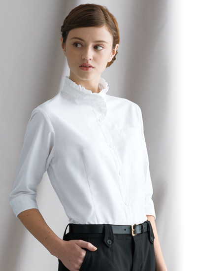 女性らしさと清潔な印象を与えるスタンドフリルタイプの七分袖ブラウス。