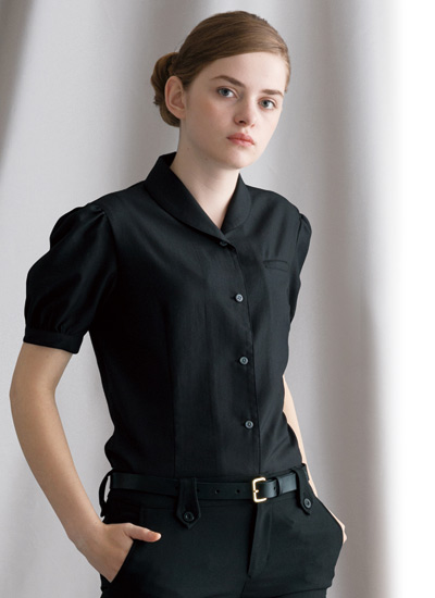 【在庫限り】[通年]高級感のあるカルゼ生地がリッチなショールカラーブラウス[半袖](31-BL8056)