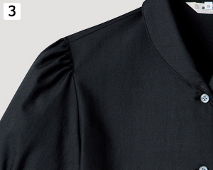 ショールカラー+パフスリーブの肩で、女性特有の丸みを帯びたラインにこだわった一枚。甘くなりすぎそうな印象をモノトーンで引き締まり、落ち着きと優しい雰囲気を生み出します。
