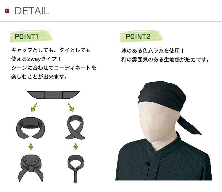 キャップとしてもタイとしても使える2wayタイプのスカーフキャップ。