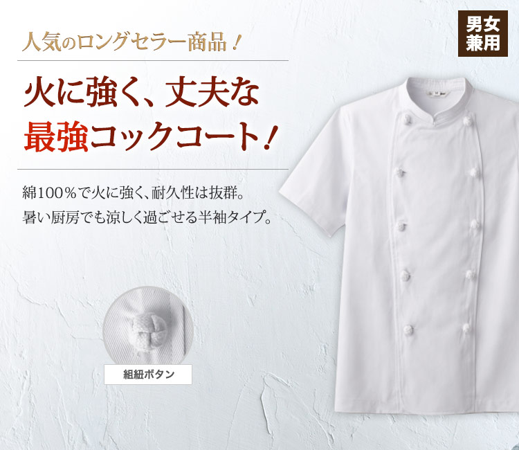 丈夫なカツラギを使用した半袖コックコート。繰り返しの洗濯や漂白にも耐えられます。熱や火に強い生地なので、厨房ワークに最適。