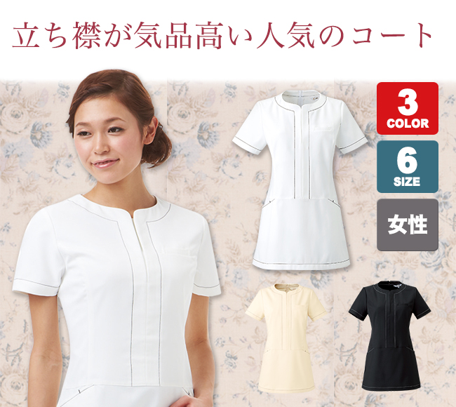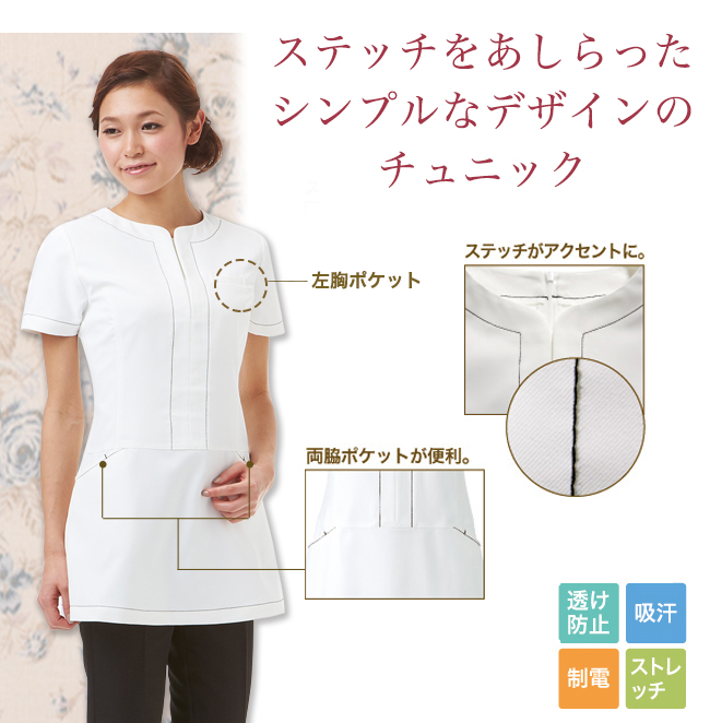 シンプルなデザインに袖元や首周りのステッチがアクセントのチュニック。便利なポケット付き。 下着が透けにくく汗をすぐ吸い取る!さらに静電気を抑え、動きやすいストレッチ素材と美容系の現場で働く女性に嬉しい機能性に優れたチュニックです