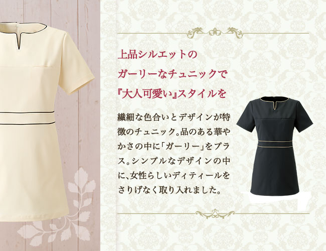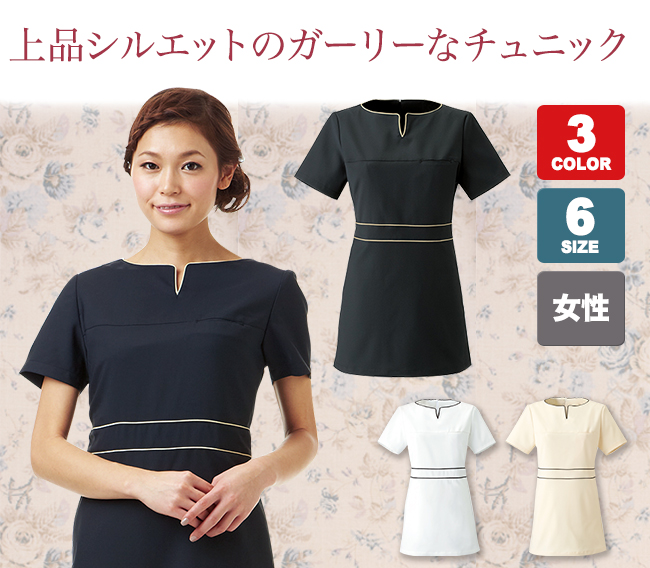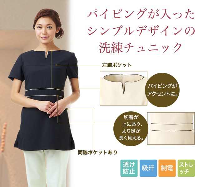 上品でシンプルなデザインにデコルテ部分と腰に入ったラインがアクセント!裾には動きやすいスリット入りです。 下着が透けにくく汗をすぐ吸い取る!さらに静電気を抑え、動きやすいストレッチ素材と美容系の現場で働く女性に嬉しい機能性に優れたチュニックです