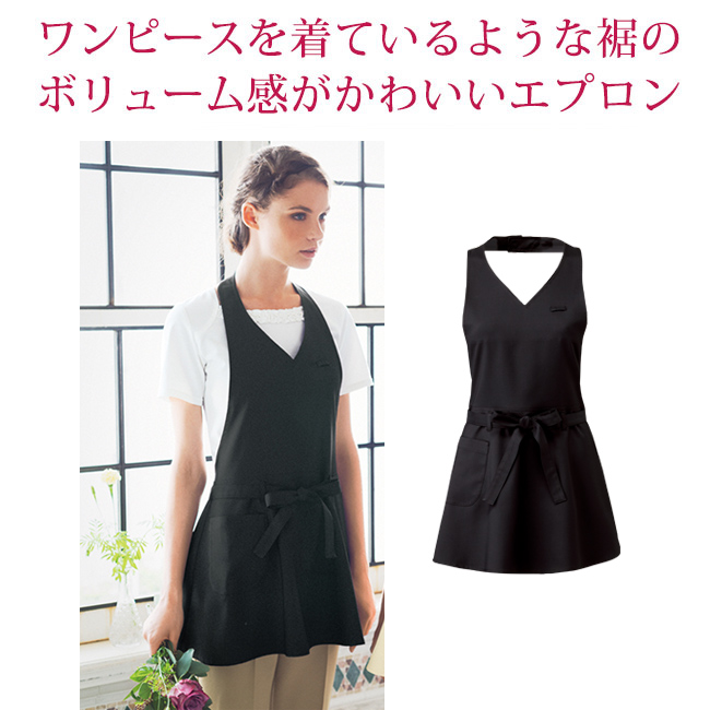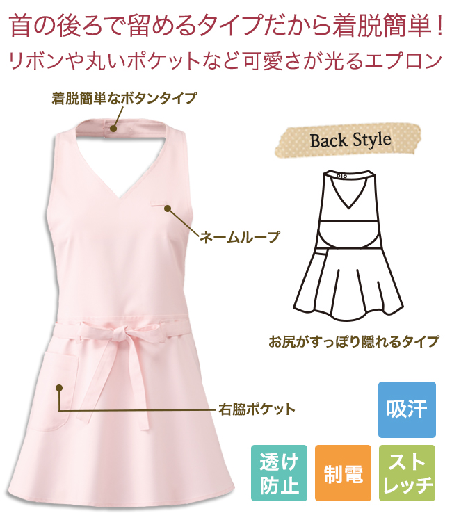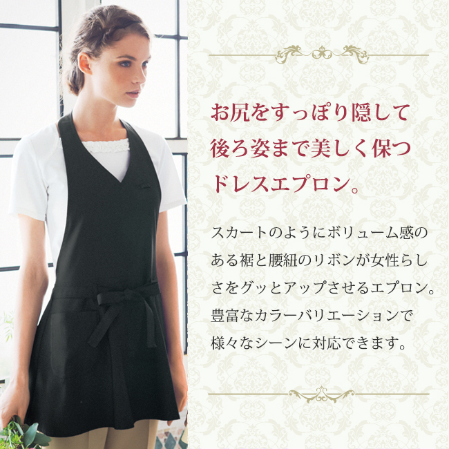 透け防止・制電・吸汗・ストレッチの高機能で常に快適! ボリューム感のある裾と腰のリボンが女性らしさをアップさせます。 お尻まですっぽり隠れて後ろ姿美人なエプロン