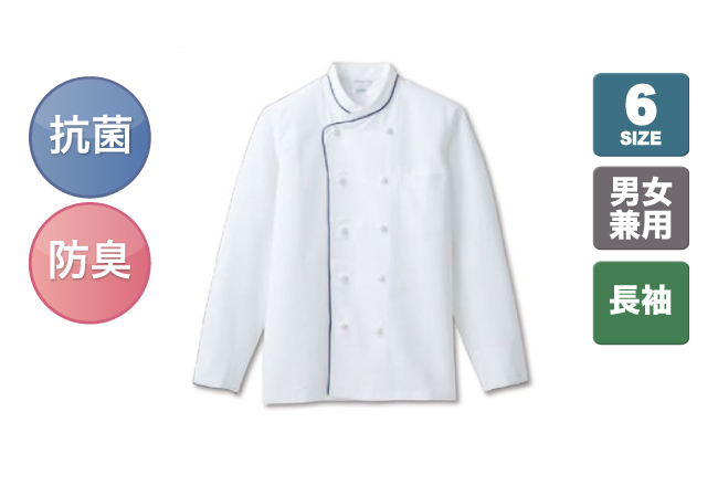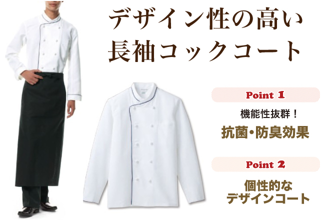 抗菌・防臭効果のある、デザイン性の高いコックコートです。