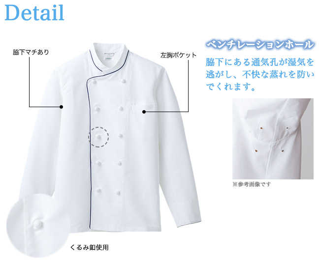 抗菌・防臭効果のある、デザイン性の高いコックコートです。