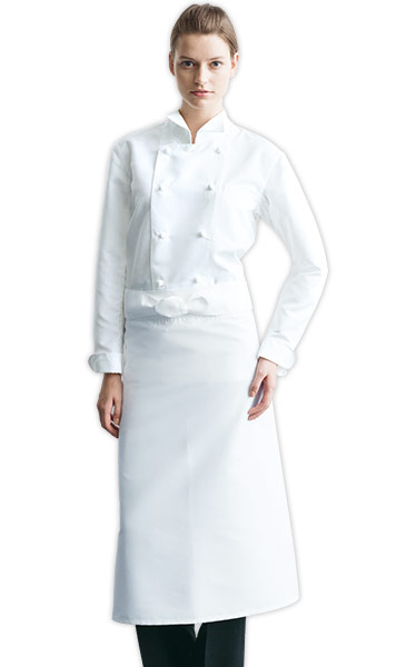 普通のコックコートとは一味違うウィングカラータイプ。高級感を演出する「くるみボタン」を採用するなど、デザイン性にこだわった一着。品よくおしゃれに着こなせます。