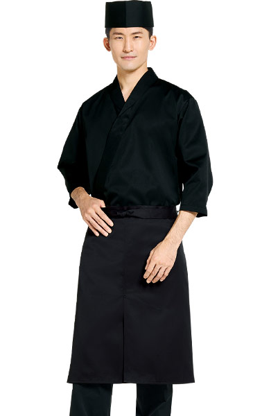伝統的なデザインは守りながらも、ショールカラーのような襟元が現代的で珍しい一枚。調理中など着崩れを防ぐため、襟元の内側にはだけ防止用のボタンを装備。長時間着用していてもきちんと感をキープします。