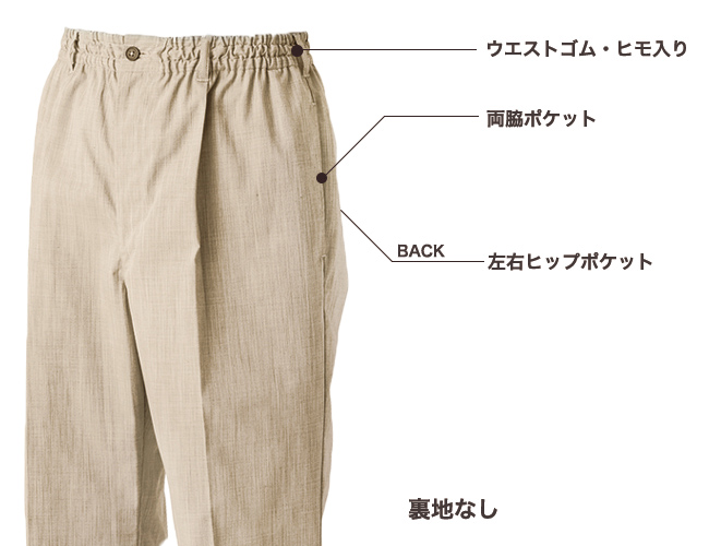 ■仕様:ウエストゴム・ヒモ入り、両脇ポケット、左右ヒップポケット