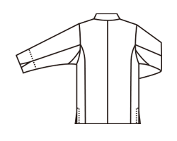 - 左胸ポケット、脇下マチ有り、ベンチレーションホール、袖口スリット、両脇スリット、比翼ボタン