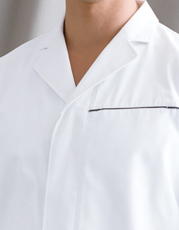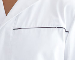 左胸ポケットにパイピングラインが入った斬新なデザイン。ラインの上にお店の名前を入れるとオリジナルの一着に。