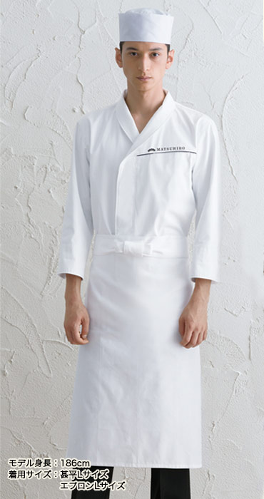 引っ張りや摩擦に強く、非常に肌触りがよい生地を使用した次世代白衣。胸元のパイピングのライン、アンダーウェアを見えにくくした襟ぐりが斬新なデザインに。ワンランク上の日本料理店の仕事着としておすすめの白衣です。