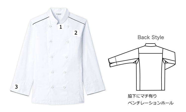 脇下はベンチレーションホール付きで、暑い調理場での不快なムレを軽減してくれます。