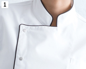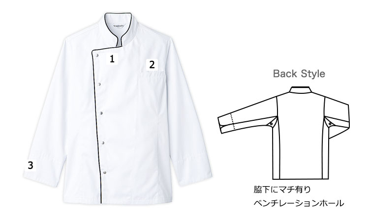 アシンメトリーな前身頃がより際立つパイピング使いが魅力的な長袖コックコート。着脱しやすいスナップボタン仕様で、万が一の時でもすぐ脱げて安全。脇下はベンチレーションホール付きで、暑い調理場での不快なムレを軽減してくれます。