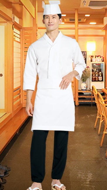 東京の名店「すし 久遠」とチトセのブランド「dradnats」の共同開発。膝上丈で足さばきが良くシンプルで品のあるプロ仕様の前掛けです。