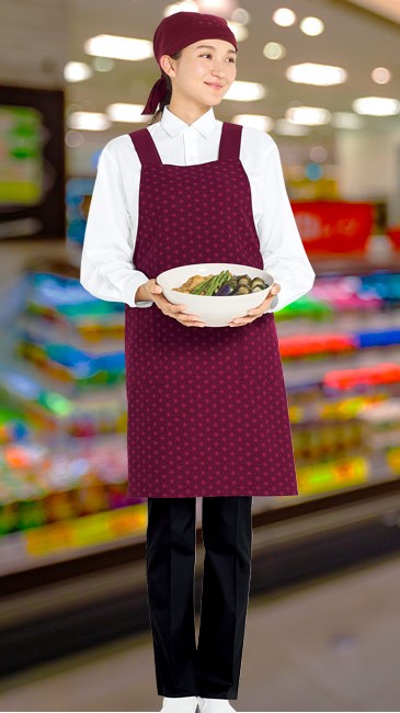 切子柄と無地の切り替えにより、落ち着いた和の雰囲気を演出できます。梳毛超ツイルを使い深みのある色は繊細で高級感ある仕上がりです。和風の飲食店やデパ地下のお惣菜の売り場などのシーンにも合い、上品な印象を与えられます。