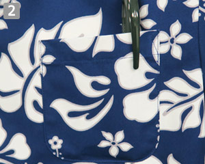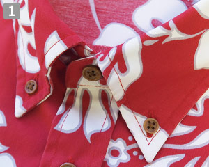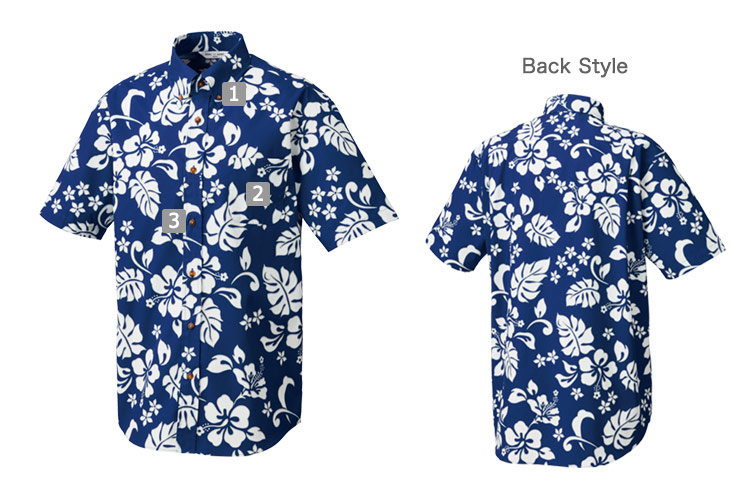 派手すぎない単色カラーの半袖アロハシャツ。白い柄の周りにグレーの縁をつけることで、メリハリをつけました。きちんと感のあるボタンダウン襟仕様です。