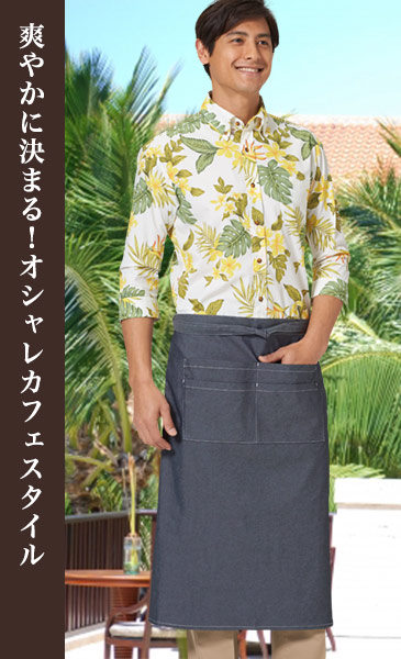 襟元はボタンダウン仕様になっているため、ラフすぎずきちんとした印象を与えます。また、アロハシャツには珍しい七分袖仕様で、肌を露出しすぎず、作業性も損なわない!飲食店にぴったりの仕様です。