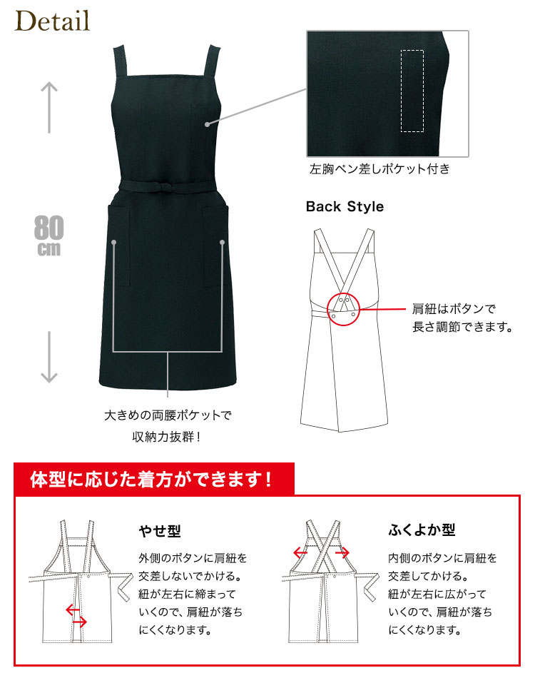 - 左胸ペン差しポケット、両脇ポケット、肩紐はボタンで長さ調節可能
