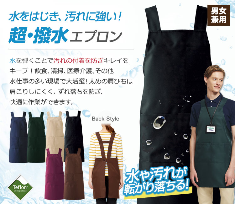 高い撥水性と防汚効果のテフロン加工で水性の汚れを弾きエプロンを美しく保ちます!