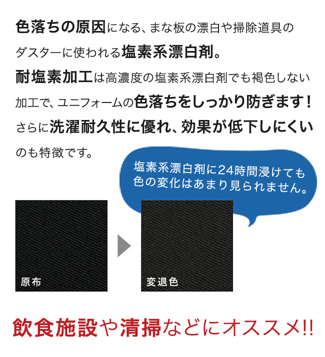 「耐塩素加工」で、塩素系漂白剤でも褐色しない!