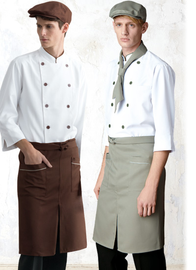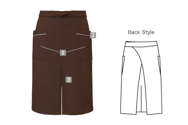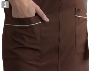 深みのあるカラーとポケット口のパイピングがオシャレなミドルエプロン。耐塩素加工を施しているため、飲食施設や清掃などにオススメのアイテムです。