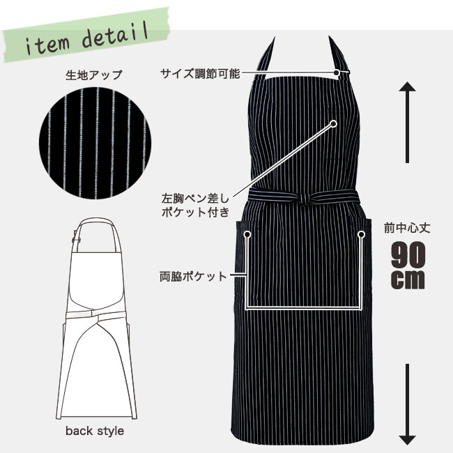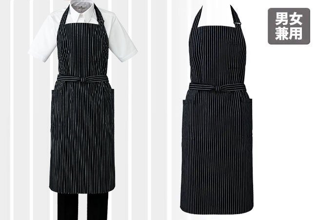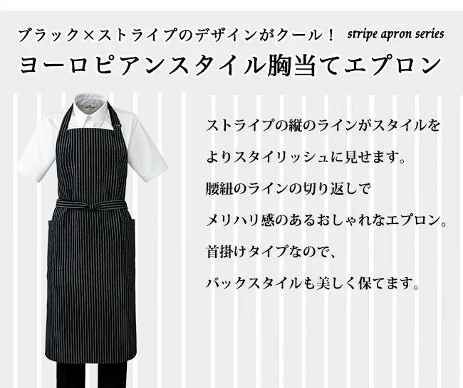 チトセ(arbe)の胸当てエプロン。 スタイリッシュなヨーロピアンスタイルシリーズ! ブラックのストライプがクールな印象の胸当てエプロン。 左胸ペン差しポケットや両脇ポケットがあり、収納力も抜群!