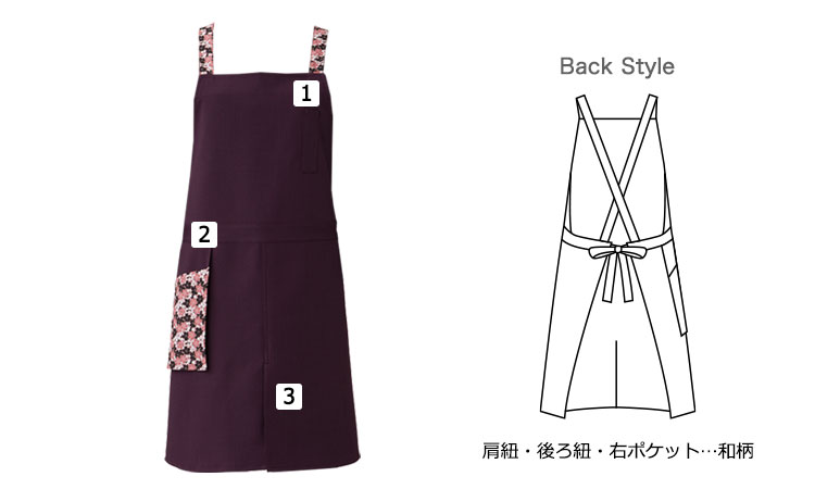 割烹・和食店・お寿司屋・そば屋・うどん屋など和空間をさらに華やかにしてくれる一着。肩紐とポケットの和柄がコーディネートのアクセントになる和風胸当てエプロン。 チリや埃が付かない制電性や、動きやすいストレッチ性に優れているため、 飲食施設での洗い物や、清掃等におすすめです。