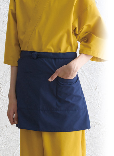 耐久性に優れたシンプルな和風ショートエプロン。 豊富なカラーバリエーションで、コーディネートを楽しめます。 割烹・和食店・お寿司屋・そば屋・うどん屋などで活躍すること間違いありません。