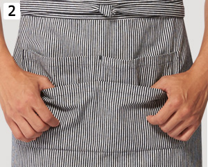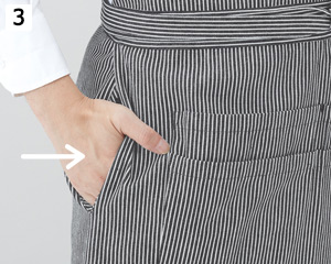 両腰にあるスリットから、エプロンの下に着用しているボトムのポケットに手を入れて鍵などの小物を取り出すことが可能。