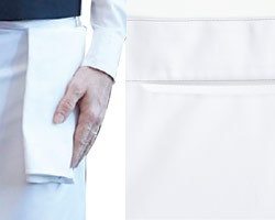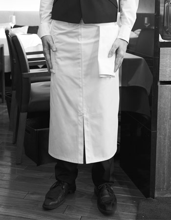 ソムリエの動き、使い手の視点で考えられ、毎日使用するナフキンを掛けられるようにしました。動きの多さを考え前中心スリットが入り、真剣勝負の場で、最高のパフォーマンスを引き出せるよう随所に生かしたエプロンです。