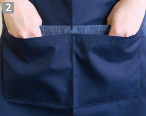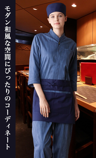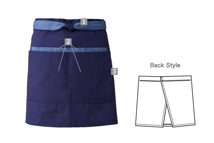 日本でしか織れないスラブ生地を配色使いとして取り入れたお洒落な和風ショートエプロン。腰紐はリバーシブルタイプで好みによって変化をつけることができます。