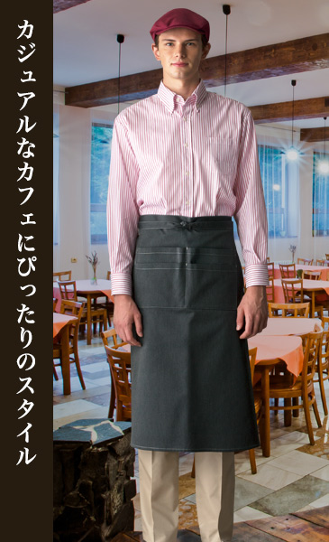 着用すれば、一気におしゃれな雰囲気になるデニム素材を使用したロングエプロン。カジュアルな空間にマッチします。