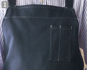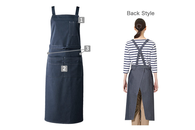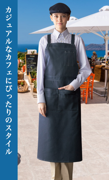 着用すれば、一気におしゃれな雰囲気になるデニム素材を使用した胸当てエプロン。カジュアルな空間にマッチします。