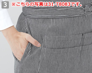 両腰にあるスリットから、エプロンの下に着用しているボトムのポケットに手を入れて鍵などの小物を取り出すことが可能です。