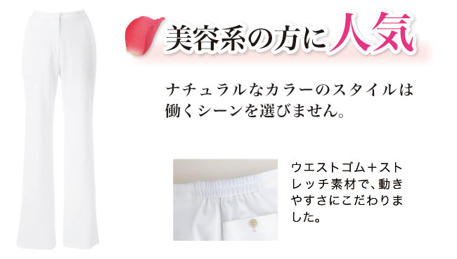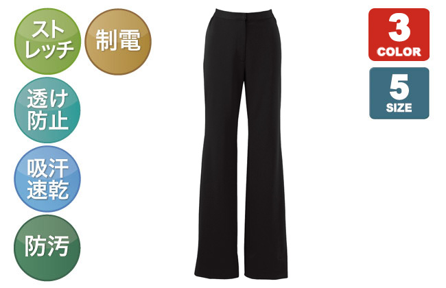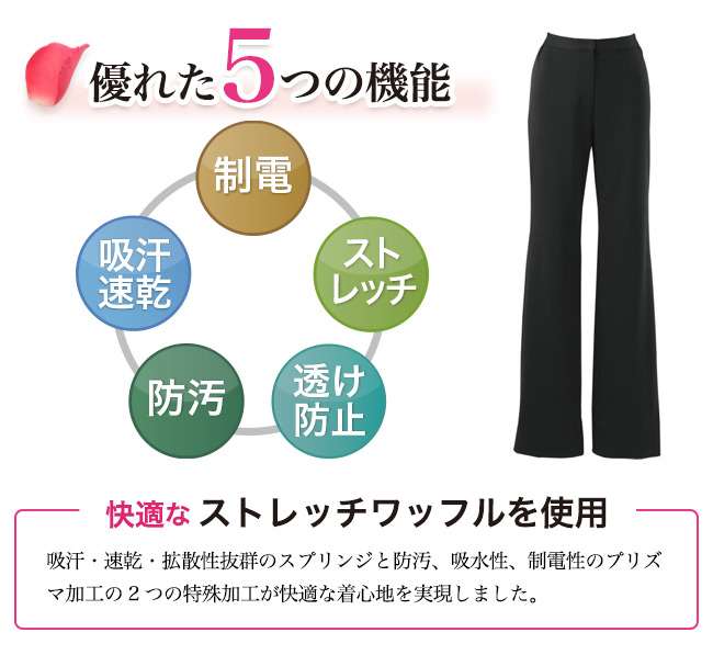ボンユニのニットワッフルパンツ。ストレッチ・透け防止・吸汗速乾・防汚・制電などの機能性に優れたパンツは、美しいシルエットながらウエストゴムやストレッチ素材で動きやすさにもこだわりました。ショップや美容、医療系の受付などにおすすめ!