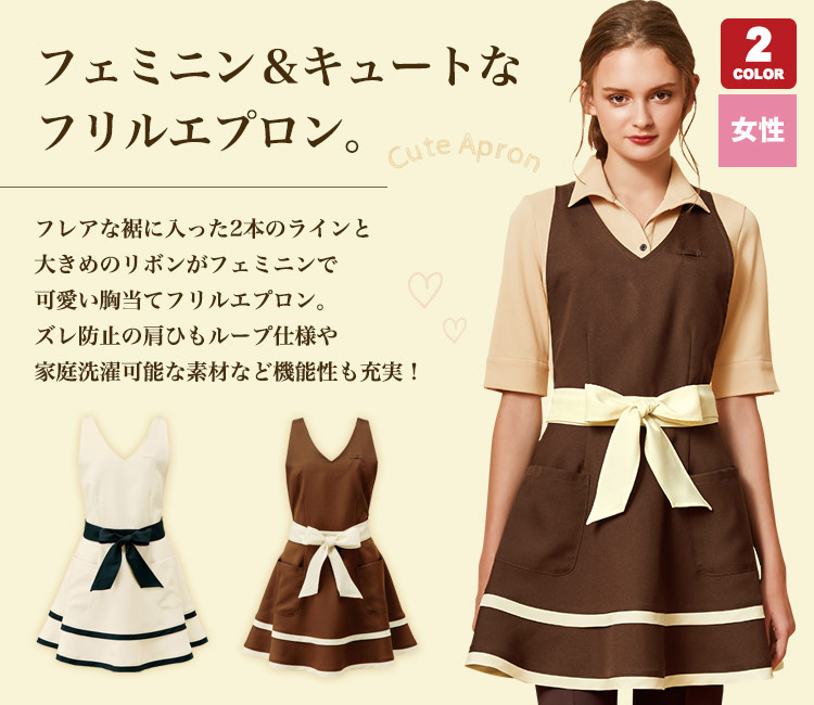ボンユニのエプロンドレス。フレアやリボンがフェミニンで可愛い胸当てエプロンは、ズレにくい肩ひもや家庭洗濯可能な素材だったりと、使い勝手の良さも魅力!