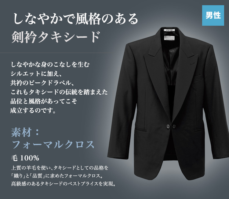 ボンユニの剣衿タキシード(男性用)。しなやかな身のこなしを生むシルエットに加え、 共衿のピークドラペル、これもタキシードの伝統を踏まえた 品位と風格があってこそ成立するのです。