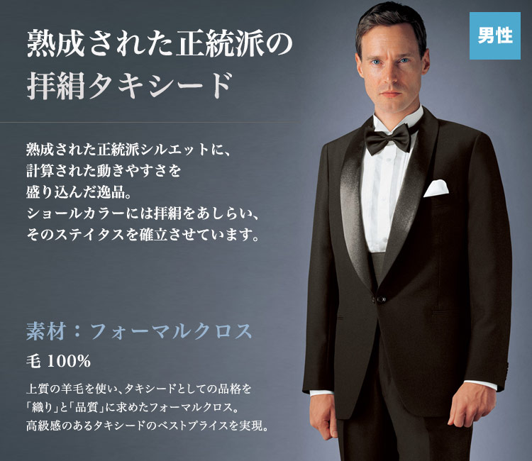 ボンユニの拝絹タキシード(男性用)。熟成された正統派シルエットに、動きやすさを盛り込んだ逸品。ショールカラーには拝絹をあしらい、そのステイタスを確立させています。