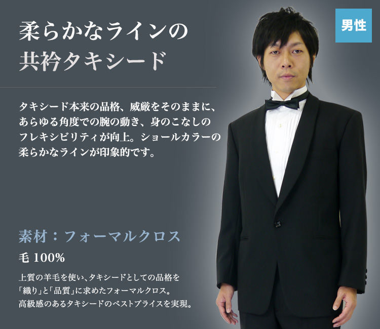タキシード本来の品格、威厳をそのままに あらゆる角度での腕の動き、身のこなしの融通性が向上。 ショールカラーの柔らかなラインが印象的です。