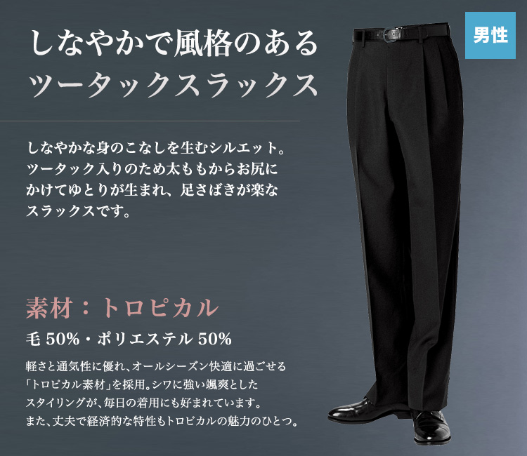 ボンユニの男性用ツータックスラックスはタキシードにピッタリ!軽さと通気性に優れ、オールシーズン快適・ノ過ごせる素材。シワに強い颯爽としたスタイリングが、毎日の着用にも好まれています。また、丈夫で経済的な特性もトロピカルの魅力の一つです。