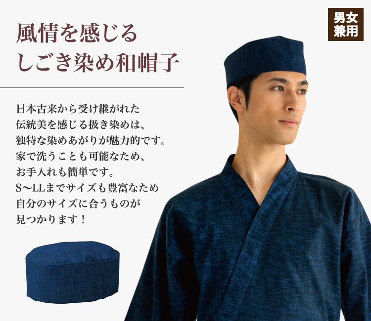 独特な色合いで趣のある扱き染め素材を仕様した綿100%の和帽子。家庭用洗濯可能なため、お手入れも簡単です。