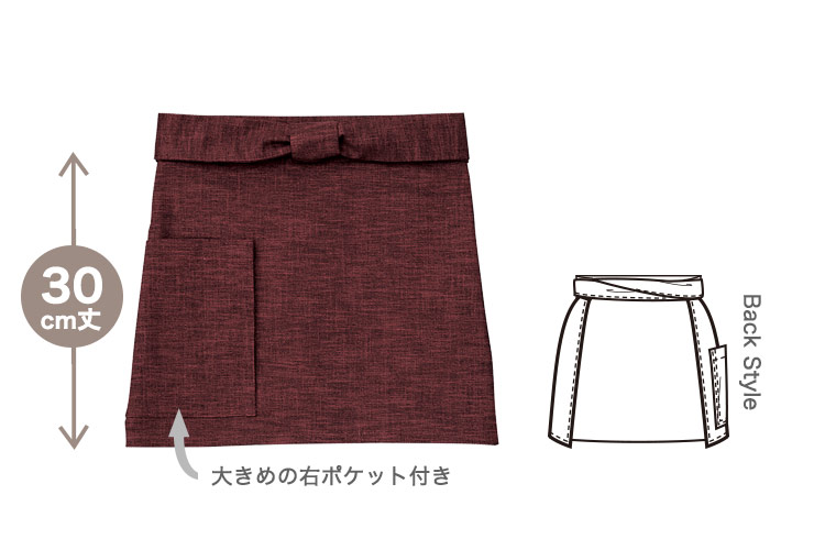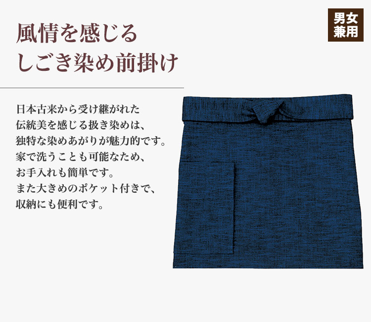 独特な色合いで趣のある扱き染め素材を仕様した綿100%の前掛け。家庭用洗濯可能なため、お手入れも簡単です。
